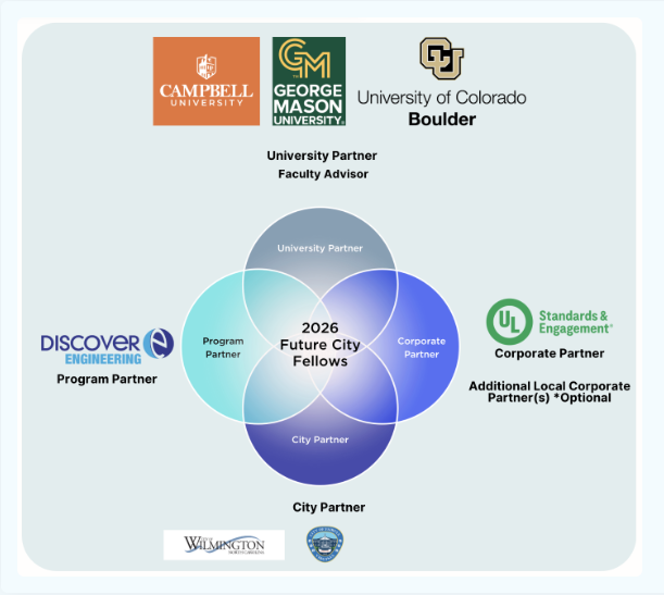 During the Future City Fellowship, an interdisciplinary undergraduate team will act as consultants to a partner city, informing its electrification strategy and incorporating technical standards from Underwriters Laboratories Research Institute’s Standards Academy. Teams have six months to research, design, and iterate on a proposal to advance electrification for the client.